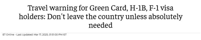 据Economic Times网站3月18日报道美国移民律师建议印度公民,包括H-1B签证持有者、留学生,甚至绿卡持有者,在当前形势下尽量避免出国旅...