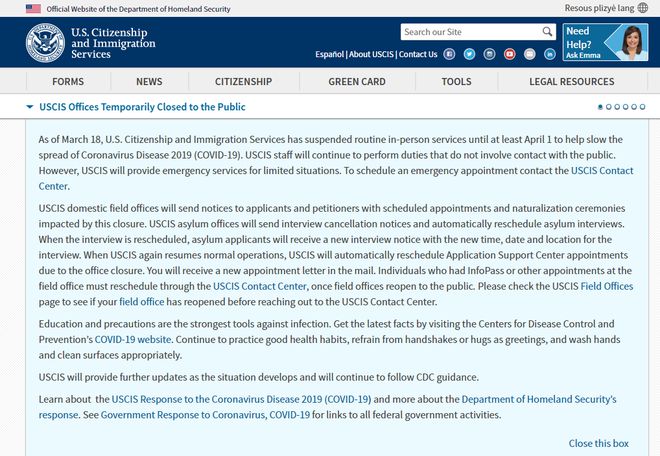 北京时间昨日,美国公民及移民服务局(USCIS)对外宣布:为了有效阻止新冠病毒的传播及有效控制确诊数量的增长,即刻起,将关闭全国范围内的所有公民及移...
